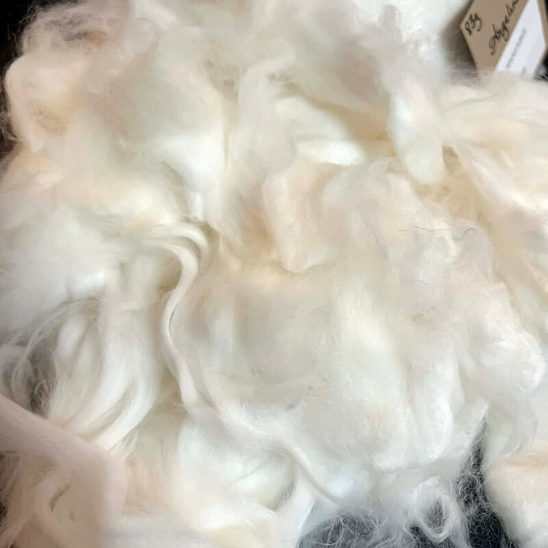 This beautiful fiber is ethically raised and gently harvested (hand clipped) from our small herd for hand-spinning. Spin on its own or blend with other luxury fibers to add halo, warmth, and luster to yarns and finished textiles.
